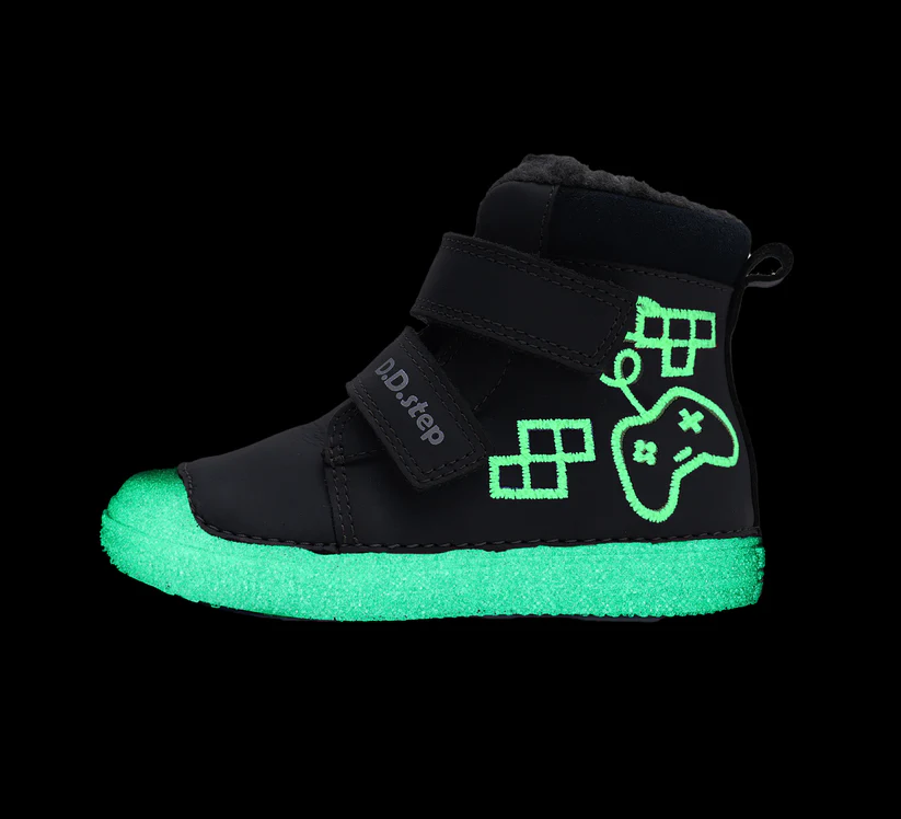 Tépőzárral szabályozható, téli gyerekcipő kívül bőrből, belül bunda béléssel elsősorban normál széles lábfejhez ajánlott. A talpa fluoreszkáló.