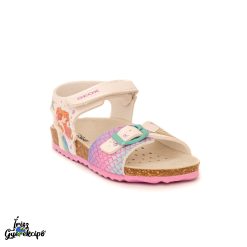 Geox Lány szandál fehér alapon Ariel mintával. A szandál talpa parafa, belül bőrborítással, elől csatos bokánál tépőzárral záródik.