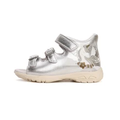 Rózsaszín bőrből készült, ezüst szív és virág rátétekkel díszített. Két tépőzáras fazonú, szupinált, lány bőrszandál.