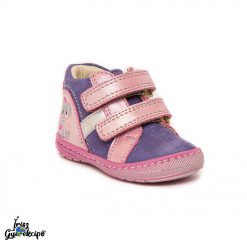 Egy tépőzáras valód bőrcipő elefánt díszítéssel. Rózsaszínű és szürkéskék bőr felső résszel, hímzett elefánttal. Elsősorban normál és keskeny lábfejhez ajánlott.