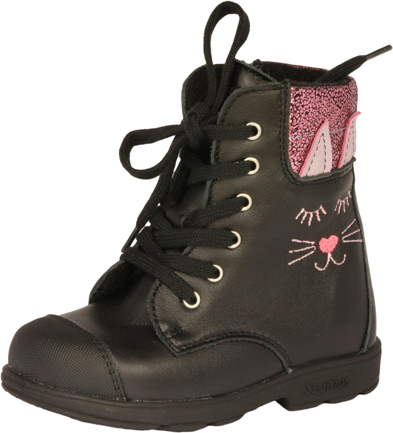 Szamos, fekete színű, kivehető talpbetétű, lány bélelt bakancs, oldalán cica mintával.